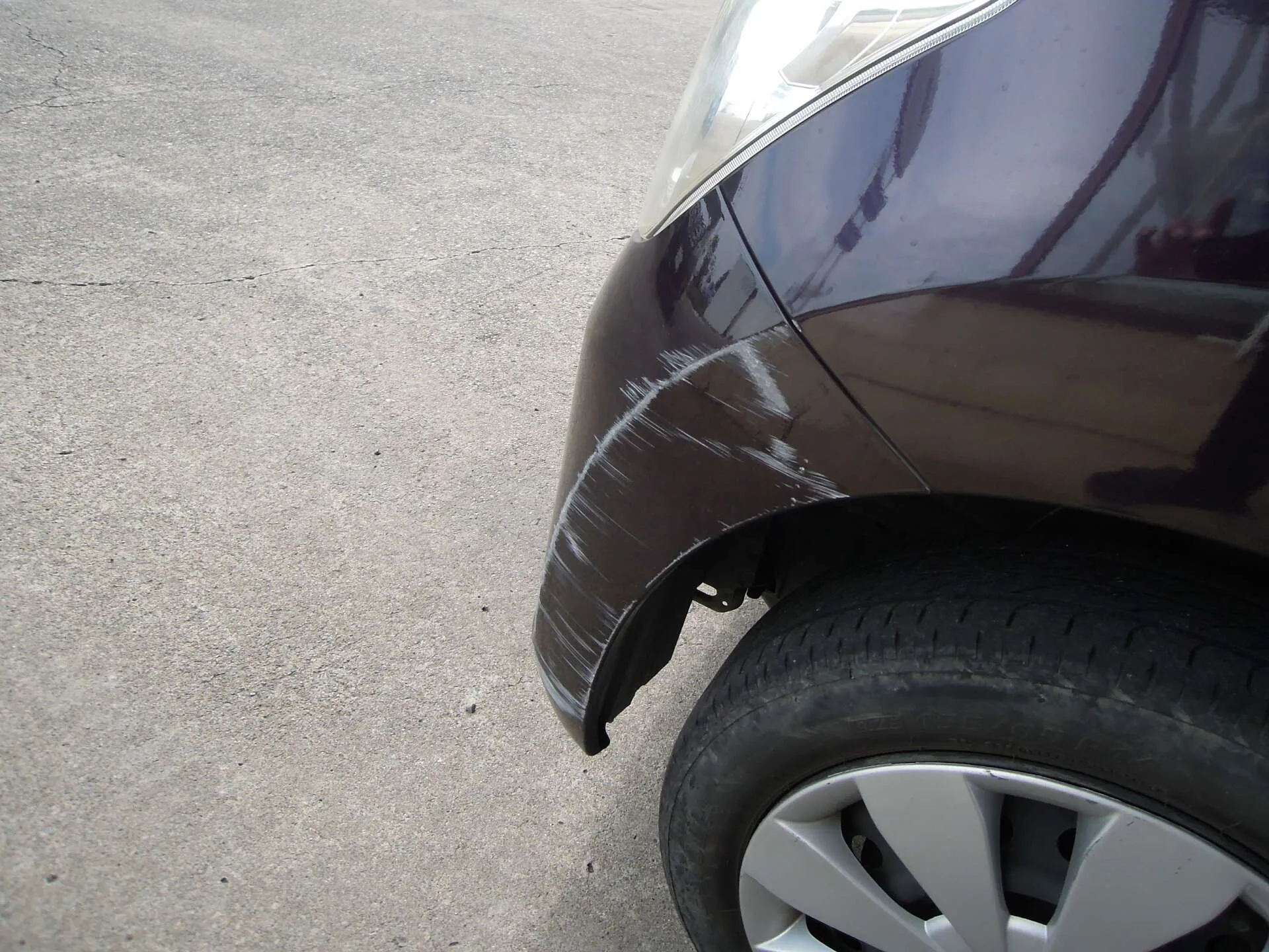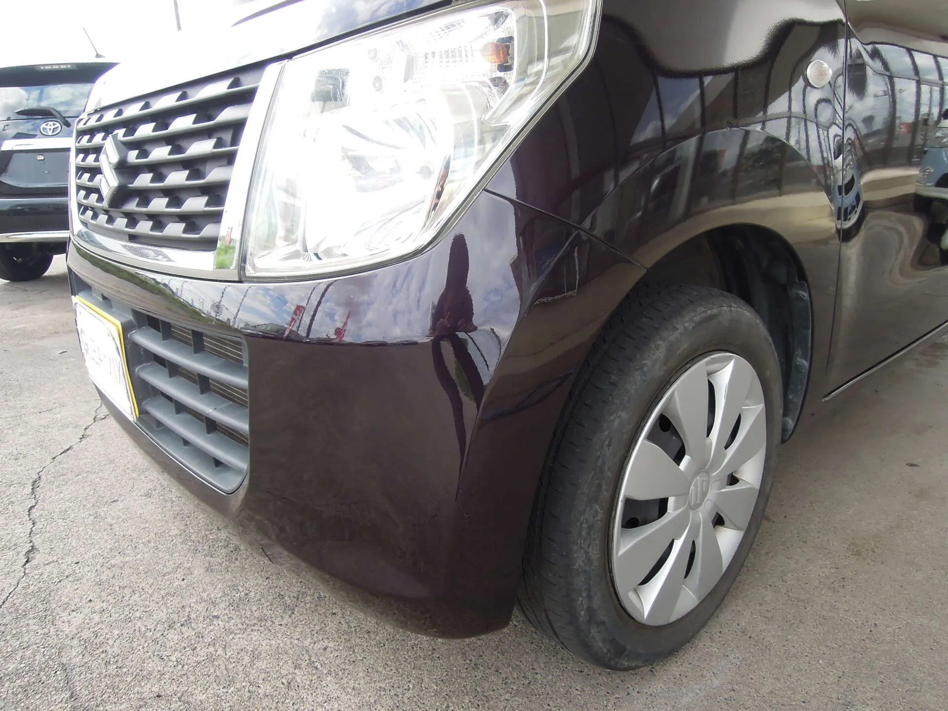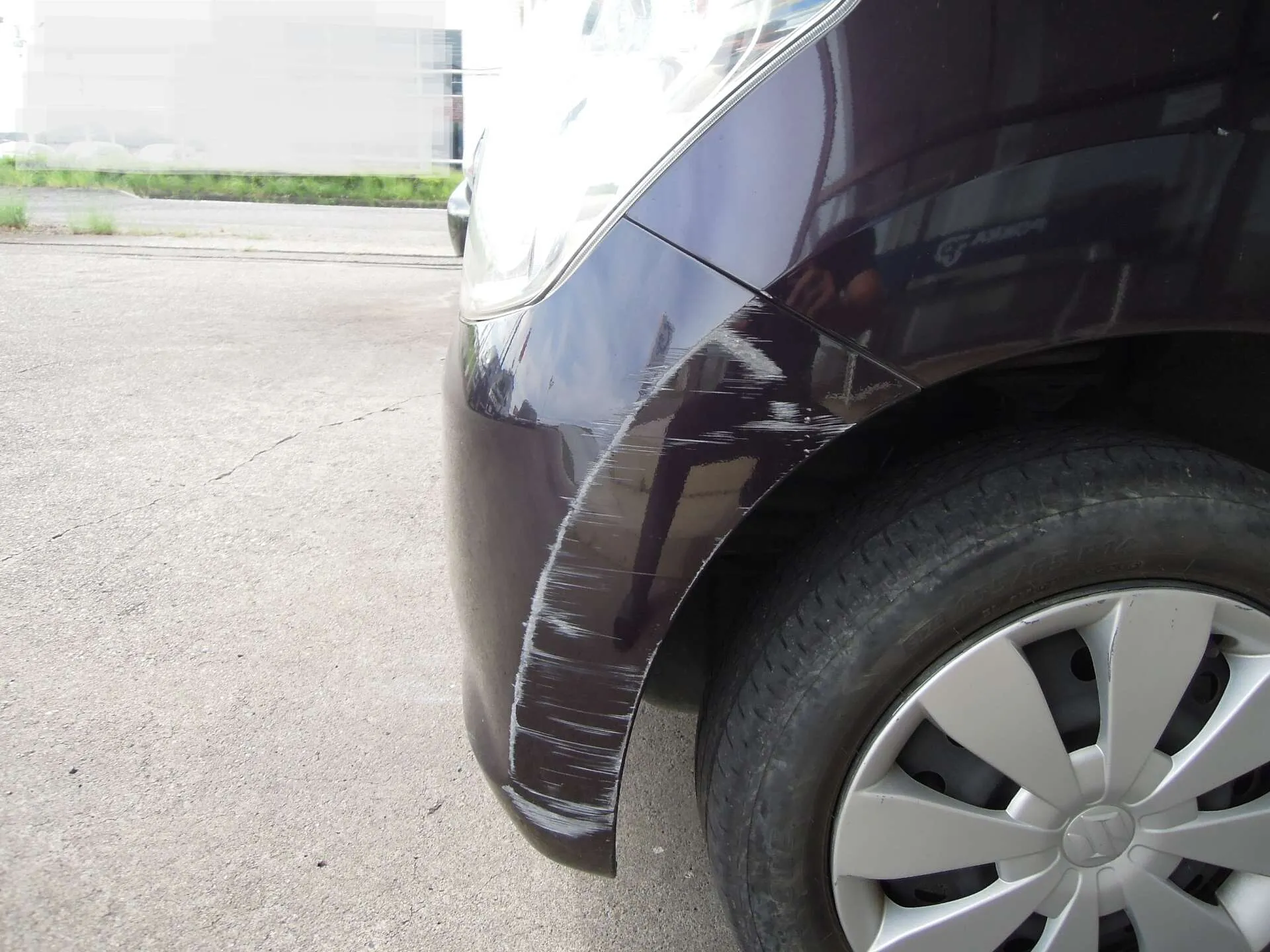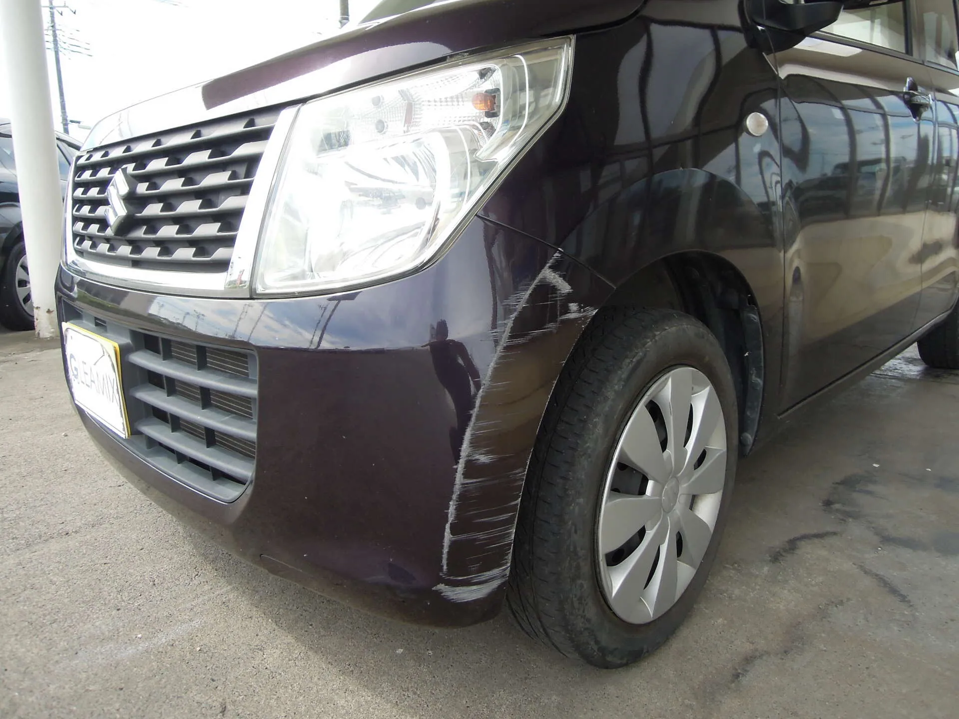 茨城県つくば市にお住まいのH様よりスズキ・ワゴンR(DBA-MH34S)のキズ修理のご依頼をいただきました。お車のカラーはパープル系で、今回の修理箇所はフロントバンパー左側の擦りキズです。
