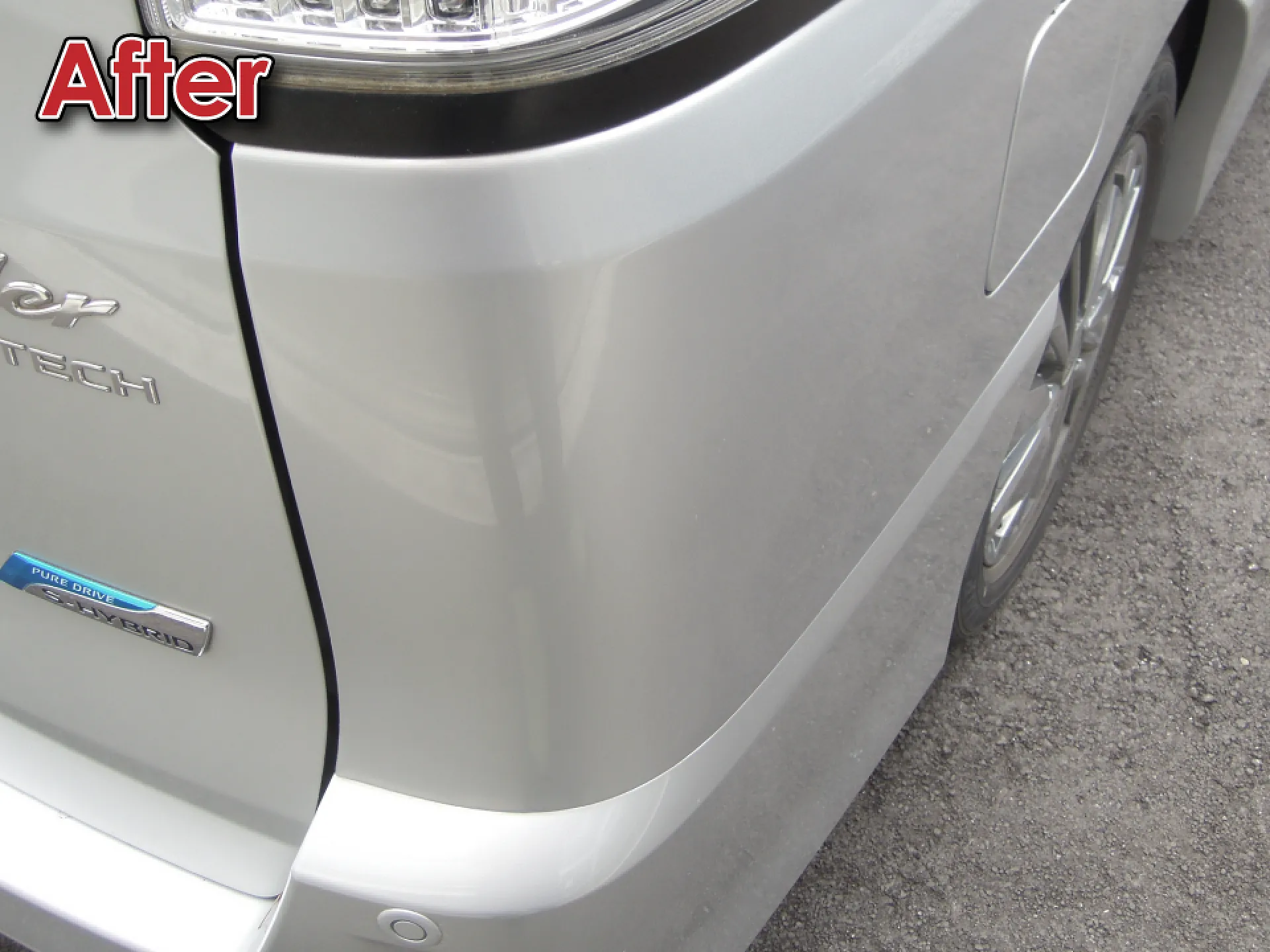 まずへこみ部分の表面を整えるところから始めました。鈑金により凹みを可能な限り元の形状に戻し、その後パテを使用して細部の面出しを行いました。パテは数回に分けて成形し、乾燥・研磨を丁寧に繰り返して滑らかなラインに整えます。塗装工程では元のシルバーと自然になじむよう色味を調整し、周辺パネルとの違和感が出ないよう慎重に塗装を進めました。塗装後は十分な乾燥を経て表面を丁寧に磨き上げて作業完了です。お引渡しの際には自然な仕上がりにT様にもご納得ご安心いただけた様子で嬉しい限りです。また何かございましたらお気軽にご相談くださいませ。