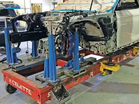 事故によって破損した車は、フレームがゆがんでしまい、人力だけで直すのは難しいです。フレーム修正機を使って、力が入ってゆがんでしまった箇所を上下左右から引っ張り、歪みを元通りになるまで矯正します。