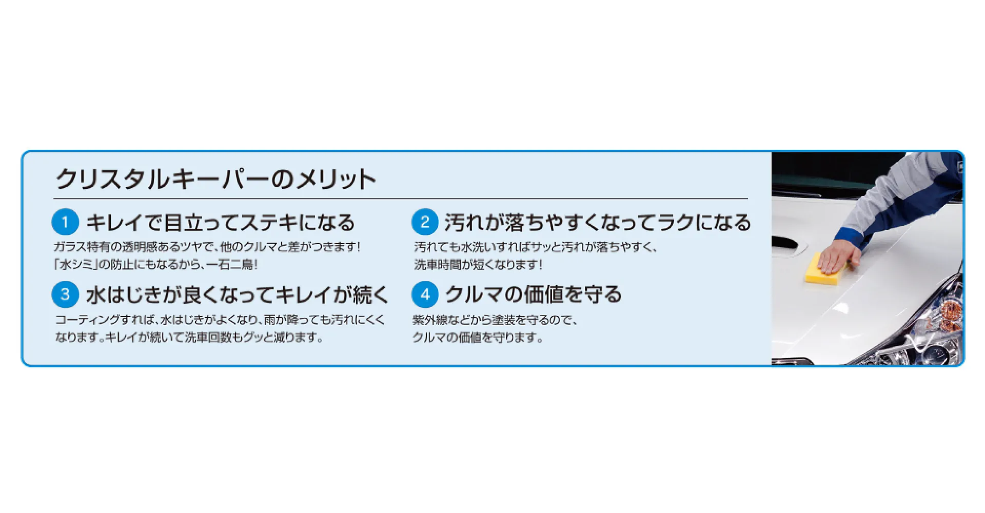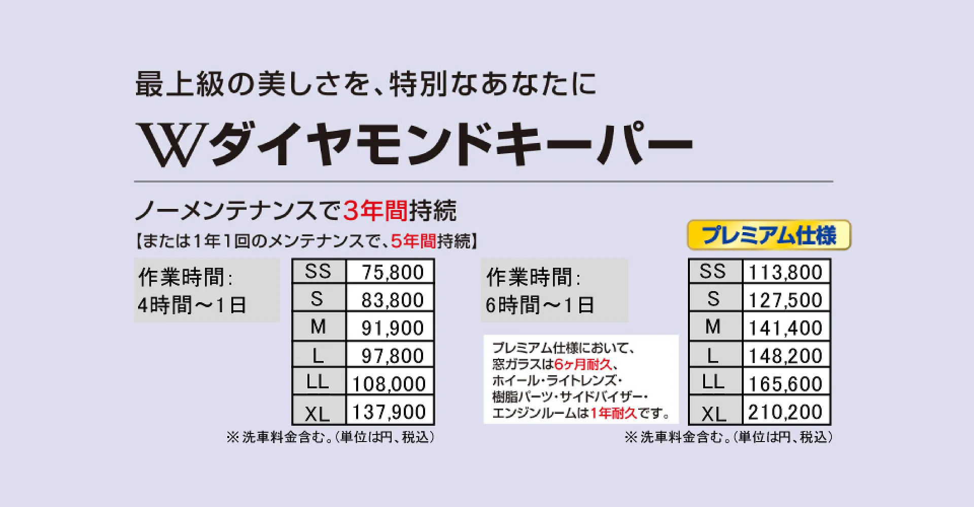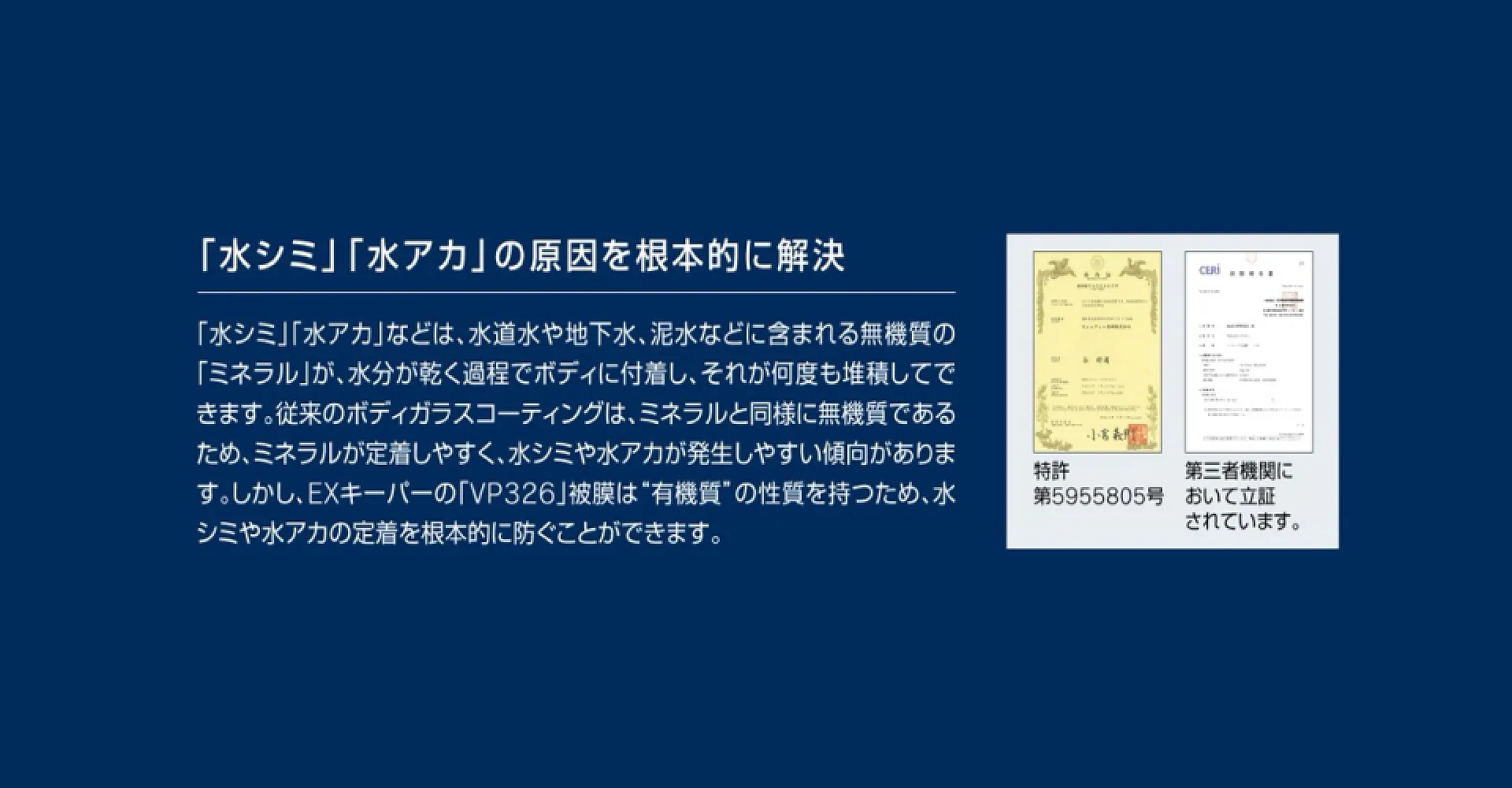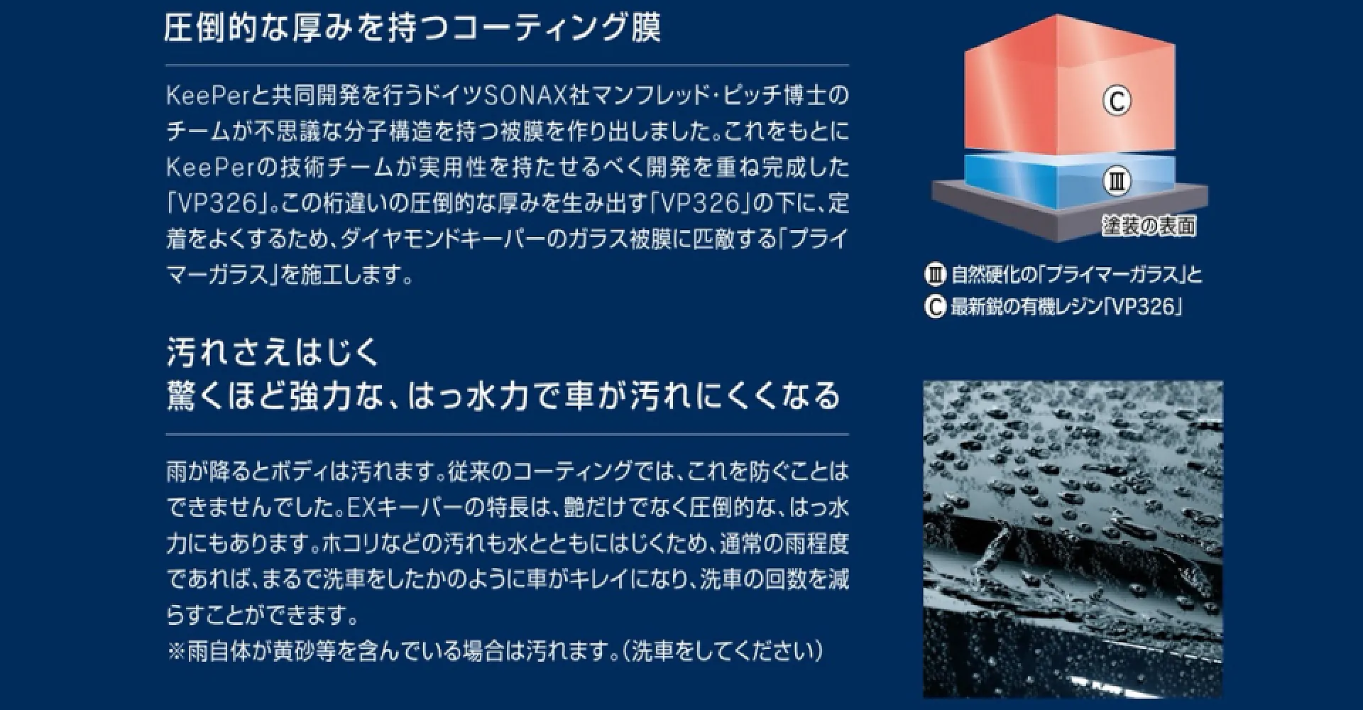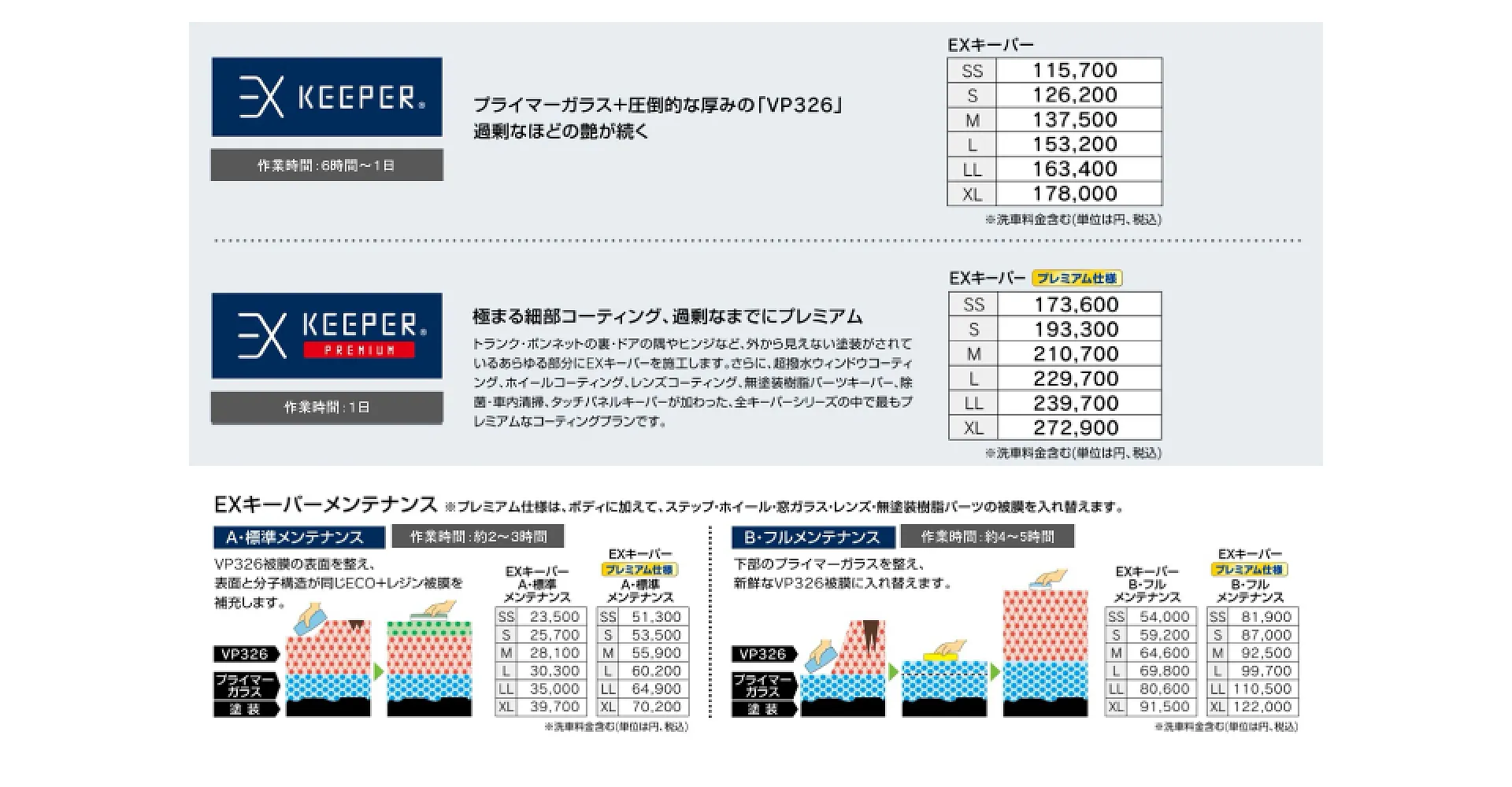 新車(納車から1か月以内)用のプレミアムなコーティングです。EXキーパーの分厚いプライマーガラスで紫外線による日焼けを防ぎ、水シミ・水アカの定着を防ぐ最新鋭の有機レジンVP326で圧倒的な撥水力と異次元の艶を作り出します。