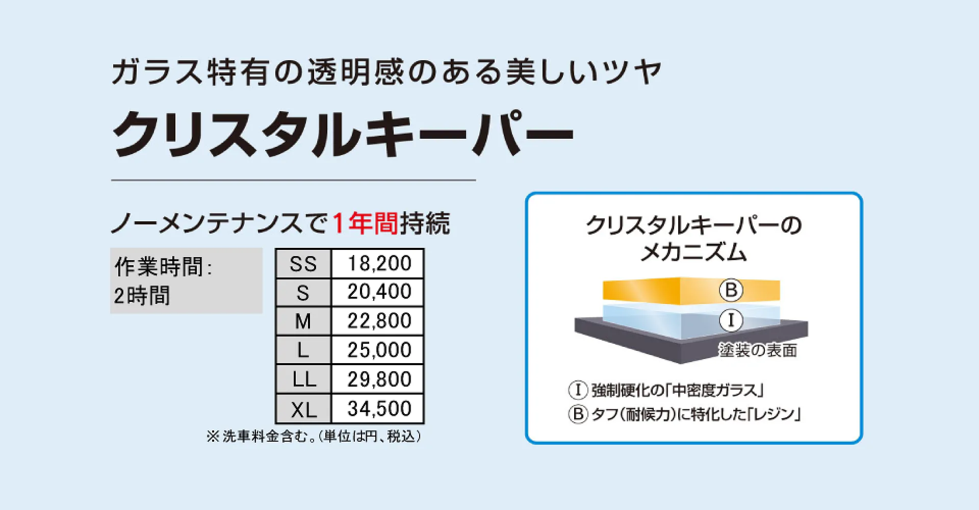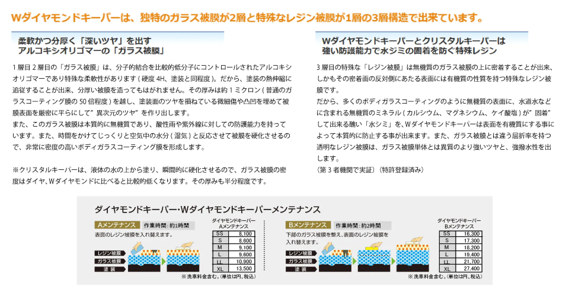 中密度ガラス被膜とレジン被膜の2層構造のコーティングです。ガラスコーティングのエントリーモデルとして、非常にお試しいただきやすい価格となっております。
