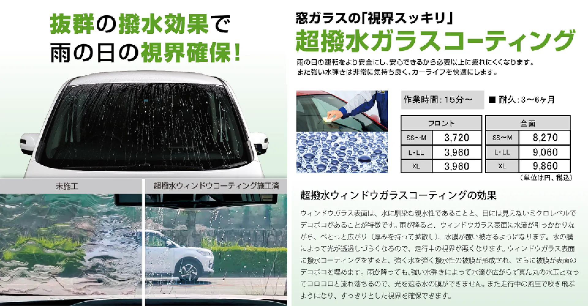 メインボディコーティングをご予約の際に「超撥水ガラスコーティング(フロント)」の施工をサービスいたします。ぜひこの機会にウィンドウガラスの撥水コーティングもお試しください!