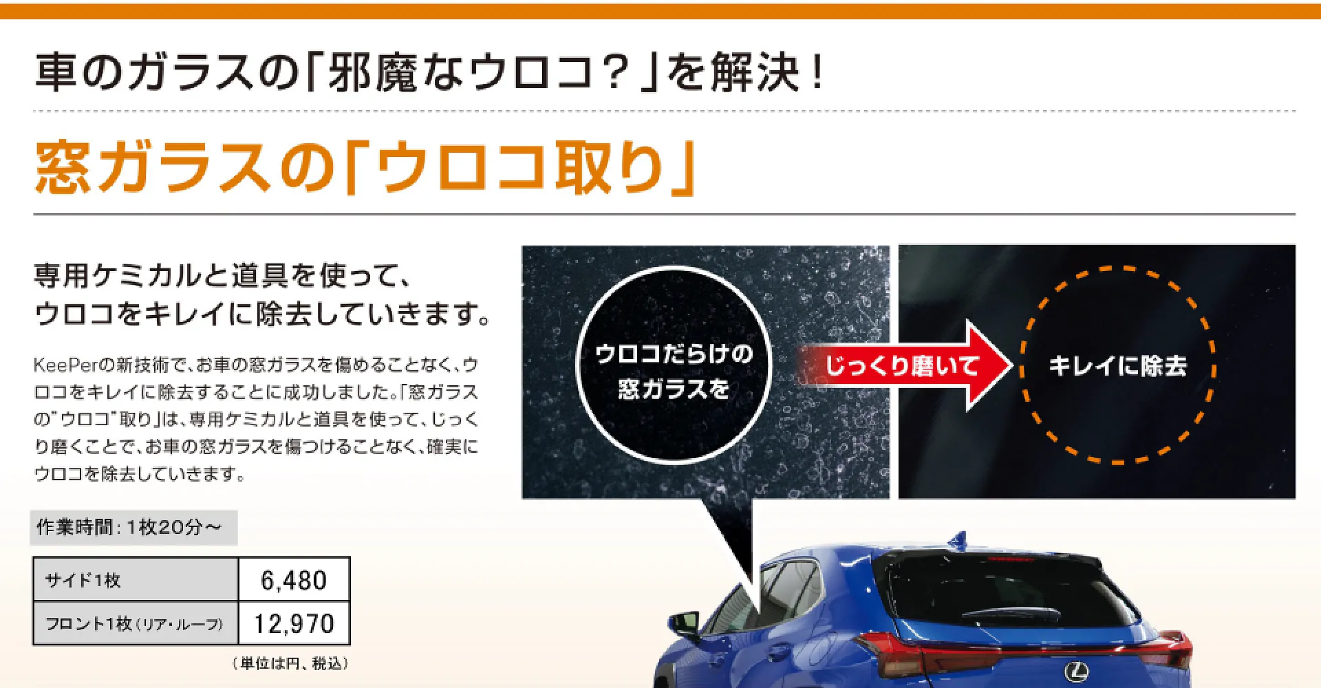 車のガラスの”ウロコ”とは、窓ガラスにびっしりついた白いシミのことで、水道水や井戸水、黄砂や石灰を含んだ雨のミネラル分が結晶化してこびりつき、雨粒も転がりづらく、視界を悪くする原因に。そんな窓ガラスにびっしりついたシミ状のウロコをポリッシャーや手磨き用具でキレイに除去します。併せて「超撥水ウィンドウガラスコーティング」の施工をおすすめいたします。