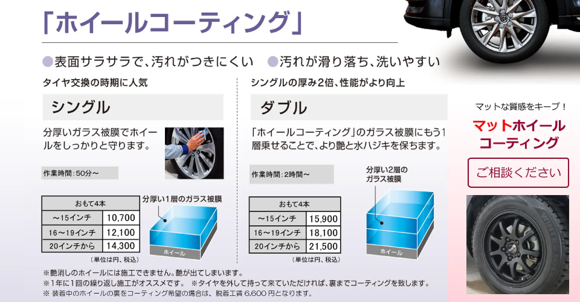 ブレーキダストのガンコな汚れがつきがちなホイールも、ホイールコーティングをすれば汚れのつきにくさ、汚れの落ちやすさも抜群にアップ。艶と水弾きを保ちながらホイールをしっかりと守ります。マットカラーのホイールもお気軽にご相談ください。