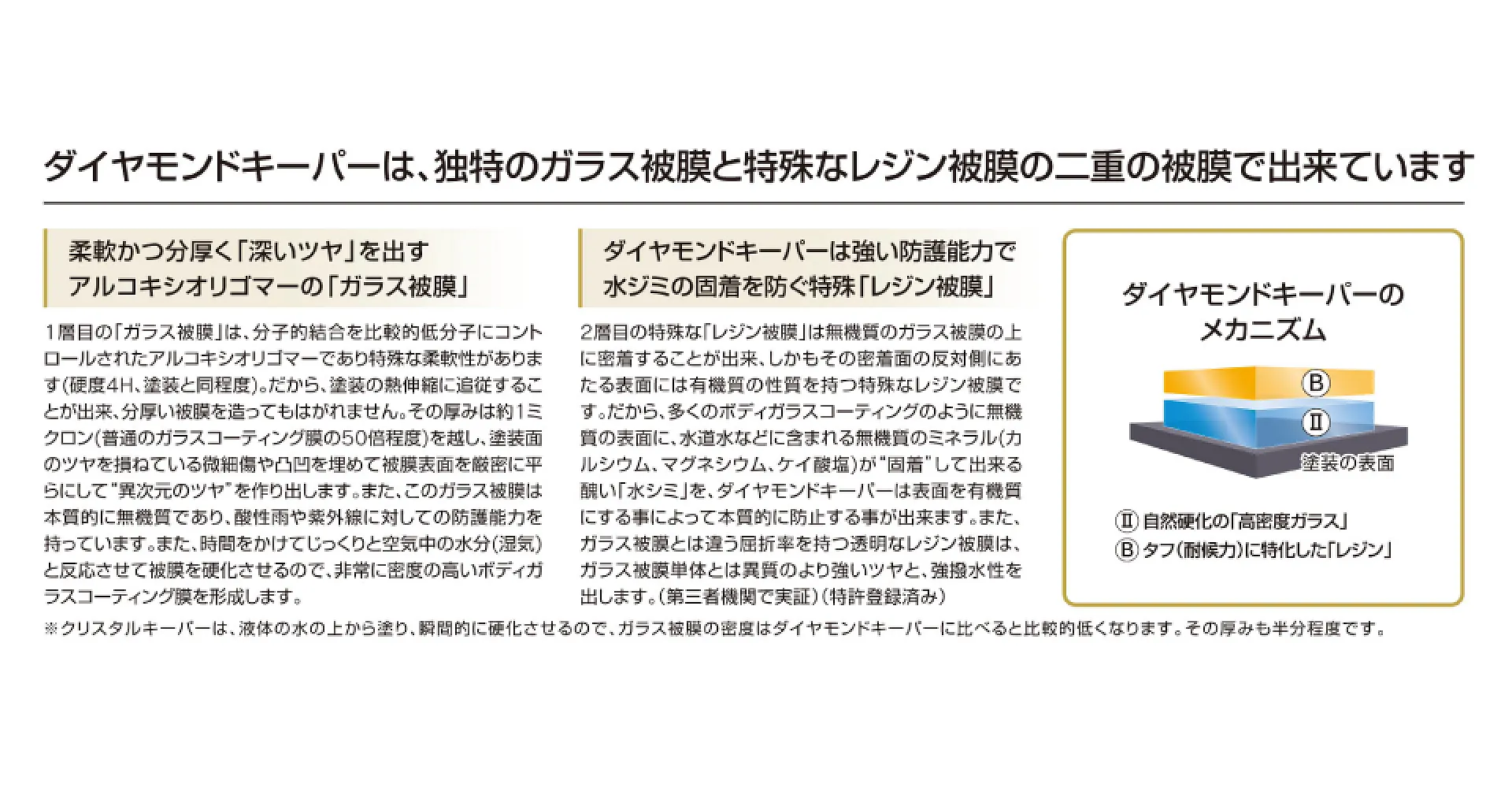 ダイヤモンドキーパーは、クルマの美しさを長期間守るために開発された高性能ガラスコーティングです。最大の特長は、高密度のガラス被膜と特殊なレジン被膜による二層構造にあります。まず塗装表面に形成されるガラス被膜は、非常に硬く透明度が高いため、まるで新車以上とも言える深いツヤと輝きを生み出します。その上に重ねられるレジン被膜は、水ジミの原因となるミネラルの固着を防ぎ、日常のお手入れを格段に楽にしてくれます。