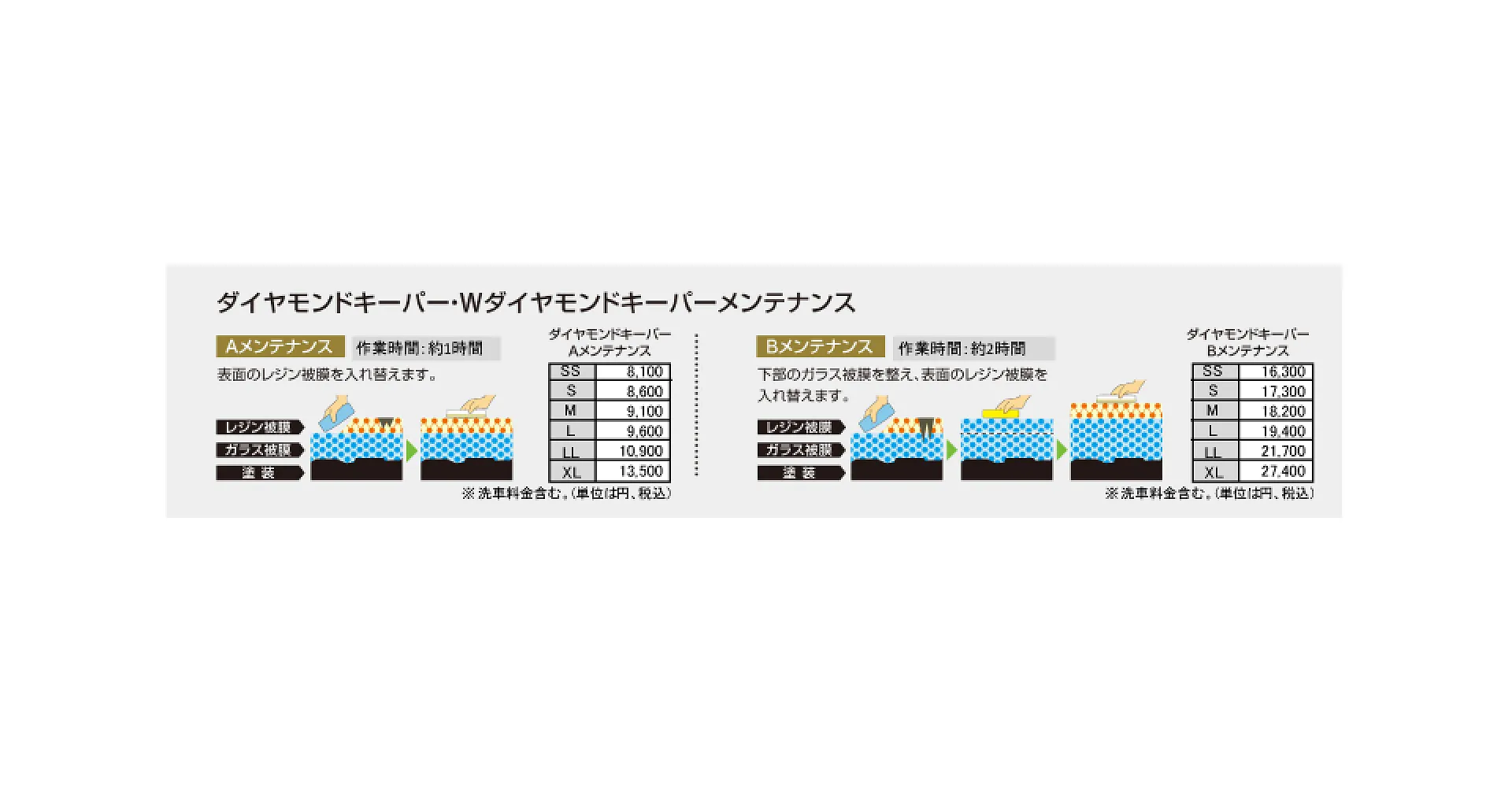 ダイヤモンドキーパーは、新車はもちろん経年車にも施工でき、ボディを見違えるようにリフレッシュします。大切な愛車をいつまでも美しく保ちたい方に、自信を持っておすすめできるコーティングです。