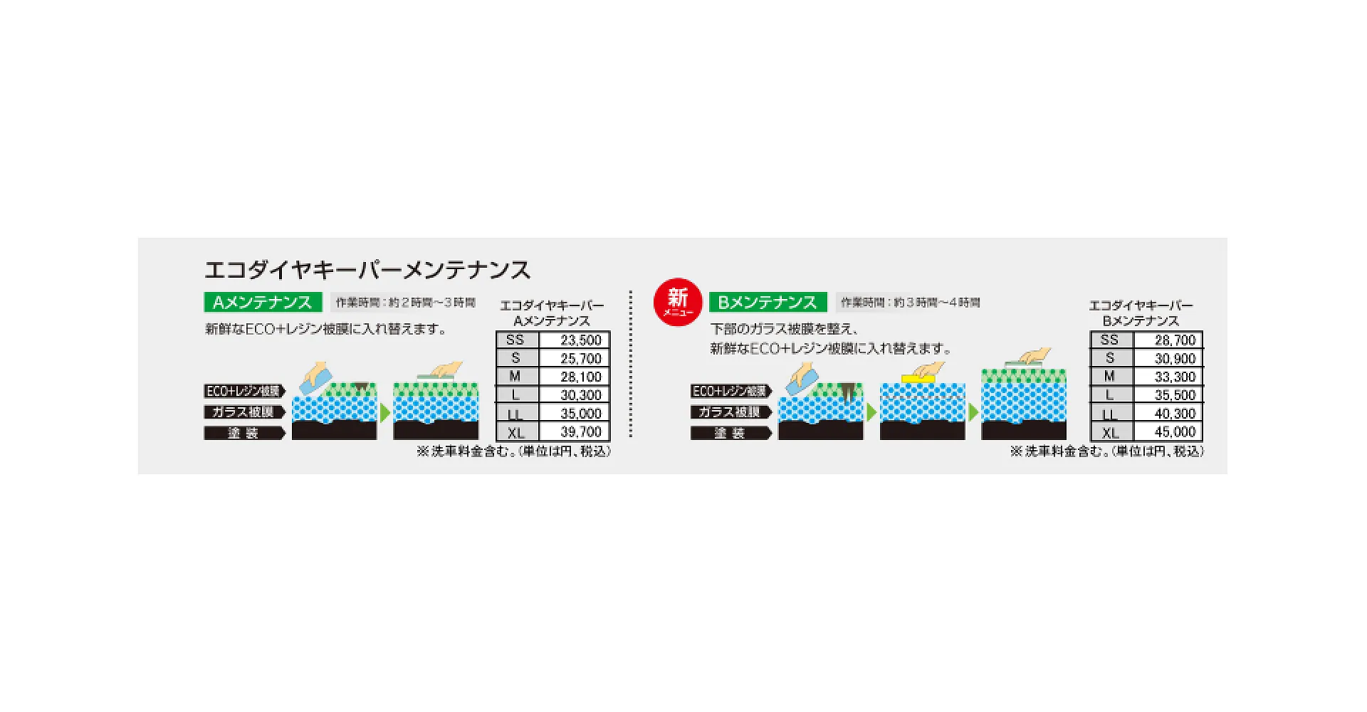 キーパーコーティング「エコダイヤキーパー」の美しさと性能を長く保つためのBメンテナンスは、被膜をしっかり整え、艶と防汚性能をよみがえらせる本格的なメンテナンスです。