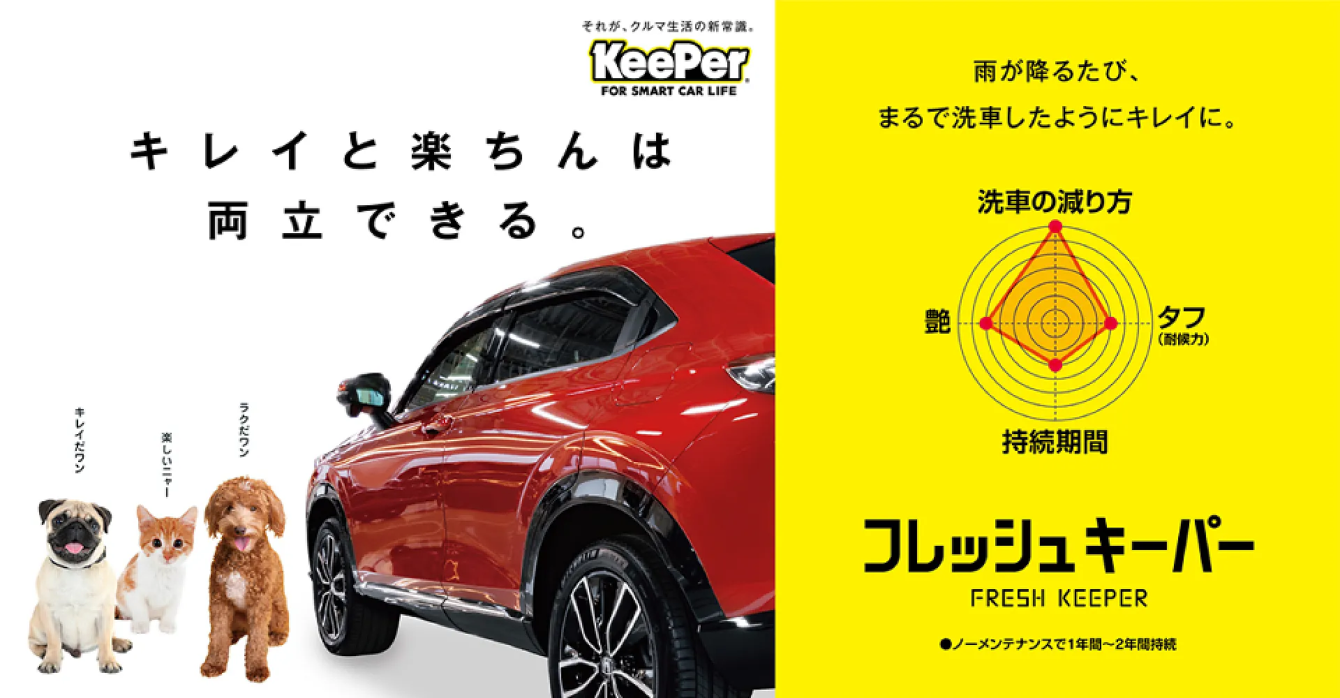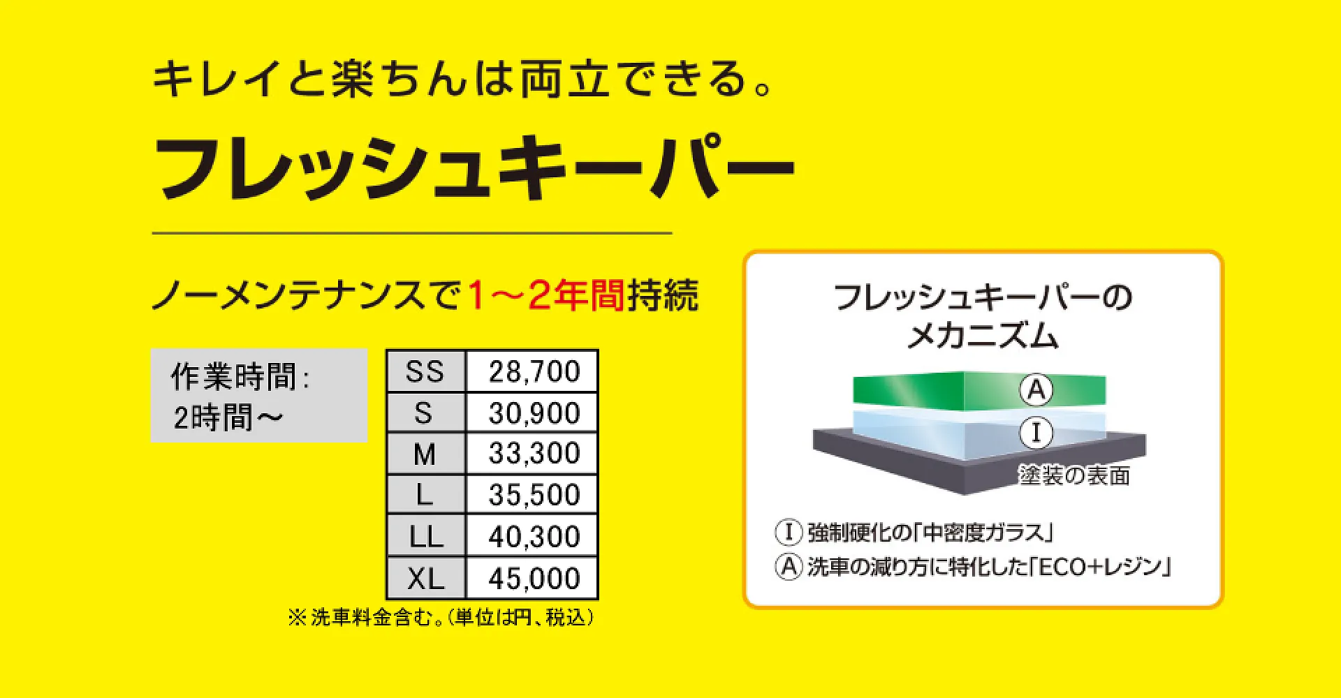 フレッシュキーパーは、洗車だけでは得られない“新車のようなツヤ”と“汚れにくさ”を実現するボディコーティングです。特殊なガラス被膜と独自のレジン被膜の二層構造により、深みのある美しい光沢を生み出しながら、雨や汚れから塗装面をしっかり守ります。さらに雨が降るたびに汚れが流れ落ちやすくなるため、普段のお手入れもぐっと簡単に。