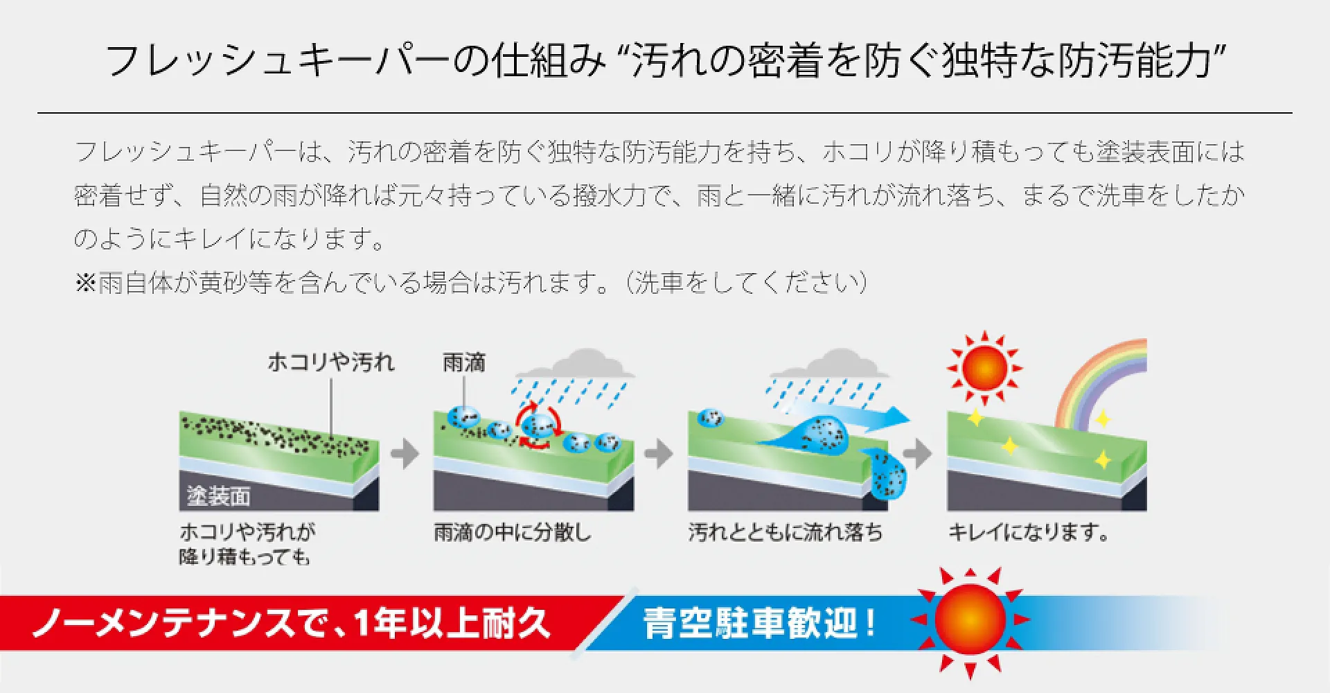 フレッシュキーパーの大きな特長は、圧倒的な「汚れにくさ」です。表面が非常に滑らかになることでホコリや水アカが付きにくく、洗車の回数や手間を減らすことができます。忙しい方や、いつもキレイな愛車を保ちたい方にぴったりのコーティングです。