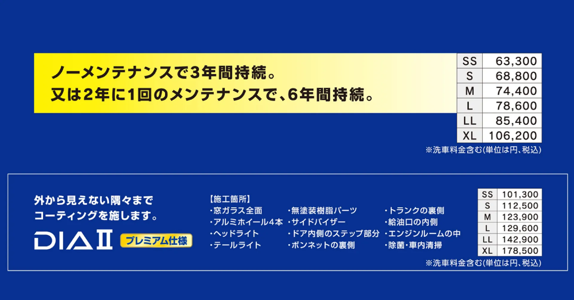 「この車のサイズは?」「いくら?」「これとこれで迷っている」などなど、コーティングの種類も豊富なため、どのメニューにしようか迷っている方も、どうぞお気軽にご相談ください!